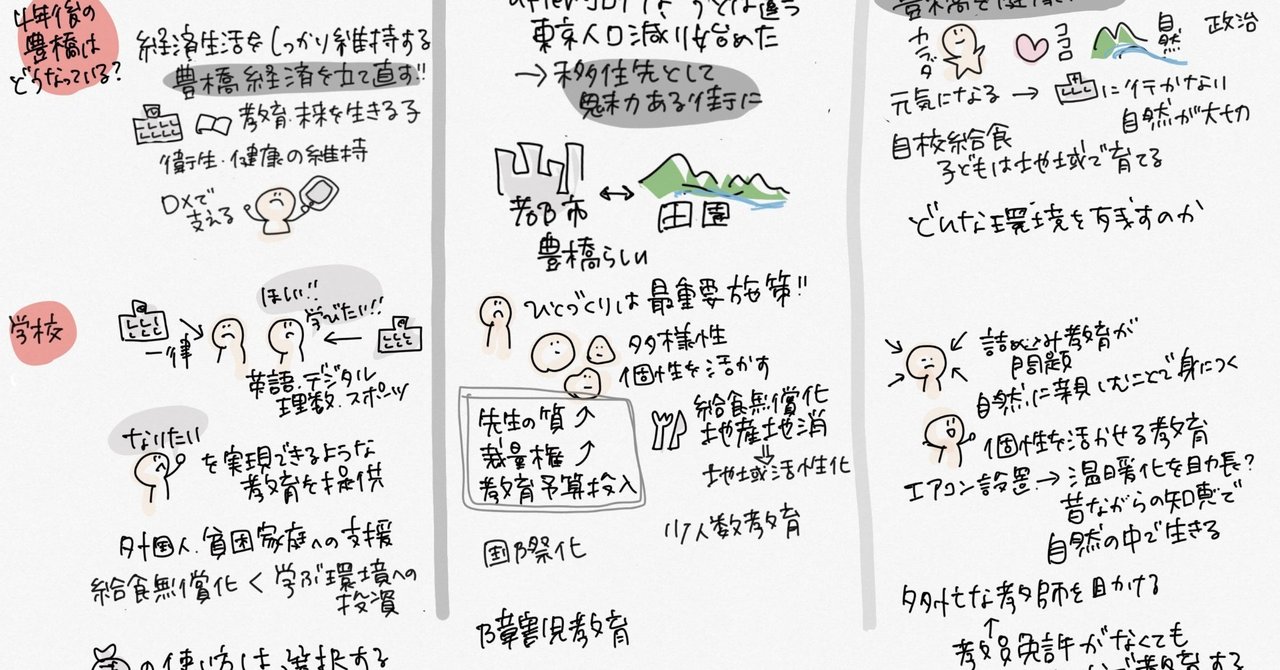 尚、今回のグラフィックレデコーディングは、村井さん個人によるお取り組みであり、公開討論会の主催者である豊橋青年会議所様やその他関係団体、また、各候補者および支援団体とは関係のないものです。村井さんご自身がなぜ、公開討論会をグラフィックレコーディングしてみようと思われたのか、その思いや背景、また実際のグラレコをご覧になっての感想をnoteにまとめられています。